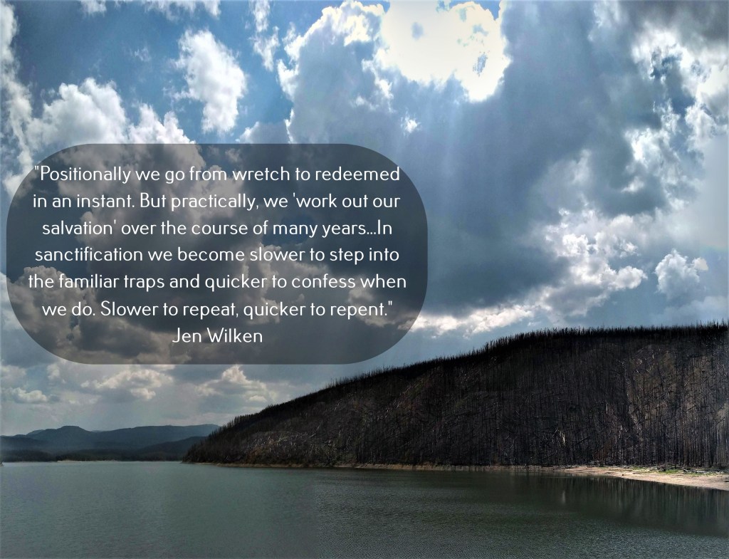 A lot of times, when Christians talk about salvation, they talk about that one point in the past where they had their eyes open to God’s love and decided accept Jesus as their Savior and Lord, and follow him. This is certainly one aspect of salvation. It is the aspect that Jen Wilkens, in the quote above, refers to as going from “wretch to redeemed in an instant”. But salvation is not only something that happened to us one time in the past, but it is also something that happens to us on a daily basis (sanctification), and something we will experience ultimately when we are in the immediate presence of God our Father (glorification).