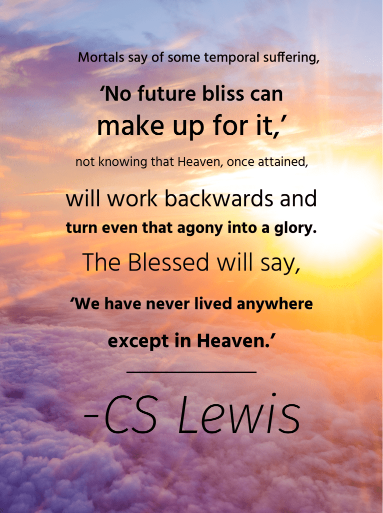 So far we have been contemplating how to think correctly about all the negative life experiences we go through, but I would like to look at the other side of the coin. I believe C.S. Lewis somewhere wrote to his readers that they should imagine a happy time. A supremely joyous experience that they could enjoy in their lifetime. He doesn’t say think about a time when you were really happy, but imagine the happiest event that you can possibly dream of. Lewis says that that imagination, that that blissful dream, cannot compare to the reality of the joy, peace and wholeness that we will have We we receive our glorious inheritance in Christ Jesus.