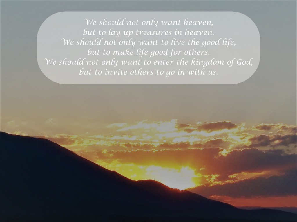 Ever since that day, pulling weeds at Dad’s place, I do almost everything in light of the question, “Can I take it with me?” Material possessions have lost their luster for me. I can’t take them with me. They aren’t eternal. They are temporal and after awhile they rust or break and end up in the dump. But when I help, give, forgive, share, go the extra mile, bend over backward, love my enemies, pray for those who mistreat me, for the sake of Jesus and the glory of God, I know that I am taking that with me, in one way or another. It is in some sense eternal; in some way not only is the person I’m helping blessed, but I am blessed, now and forever.